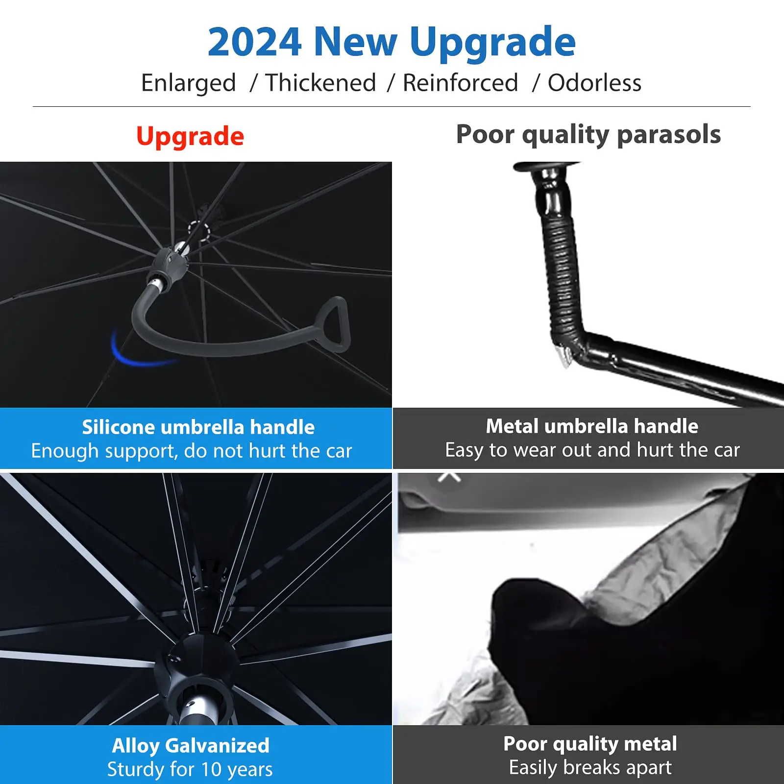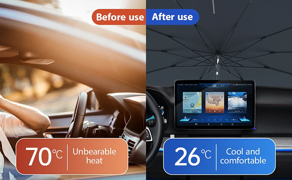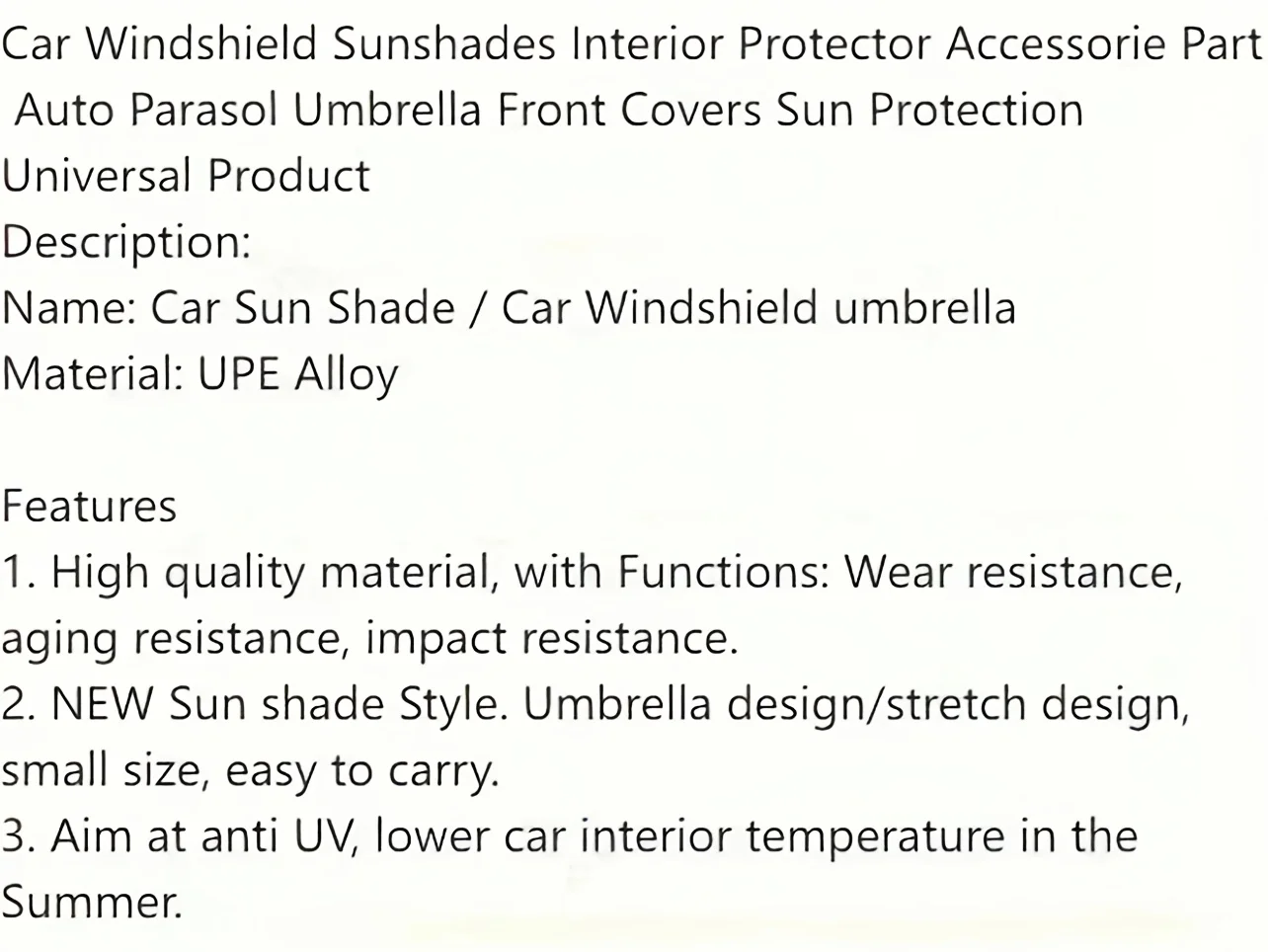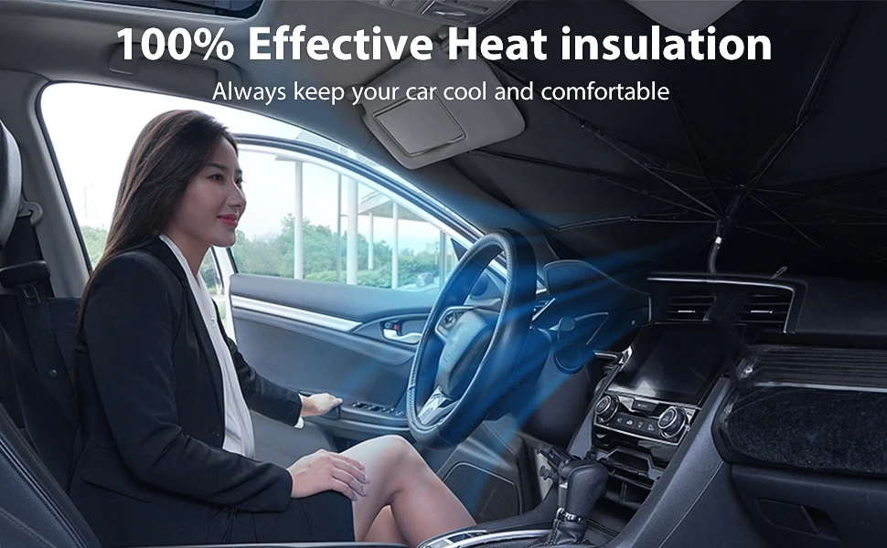 Effective UV Blocked All new upgraded dense polyester fabrics with reflective coating effectively block out the UV rays and the heat to protect the leather interior inside. Excellent Sun Protection & Heat Insulation Completely cuts off the heat conduction path to block it out, up to 16 degree temperature drop. Shield the Cabin from the Sun Bat wing-shaped with foldable design offers larger shading area for better heat insulation. Soft Hemmed Edges No light will leak in around the edges and won’t scratch the interior or glass. Lighter Material, More Durable Glass fiber rib is much sturdier with better support, made to last. Wide Compatibility Custom-made to fit for various car models. Eco-Friendly Material Safe & Odorless Renewable PET material offers long-time reliability, and is RoHs certified. Multi-Scenario Applicable Keep the cabin cool and protect your privacy and interior. Super-Easy to Use 1. Open the umbrella in the car. 2. Set it up behind the windshield. 3. Let down the windshield sun shades of both driver and passenger seat to fix the umbrella. Product Title: 2024 Car Windshield Sun Shade Umbrella Foldable Sunshade Front Window Cover for UV Ray Block Heat Protection Protector Parasol Features: Effective UV Ray Blocker: Designed to block harmful UV rays, preventing damage to your car’s interior and keeping it cool. Heat Protection: Reflects heat and reduces the temperature inside your car, offering a more comfortable driving experience. Foldable and Easy to Store: This sunshade umbrella folds easily, allowing you to store it in your car without taking up much space. Universal Fit: Suitable for most vehicles, from small cars to SUVs and trucks. Durable Material: Made from high-quality, heat-resistant material for long-lasting use. Easy Installation: Simple to open and install on your car’s front windshield, making it a quick solution for sun protection. Product Description: Keep your car cool and protected with the 2024 Car Windshield Sun Shade Umbrella. Designed to block harmful UV rays and reflect heat, this foldable sunshade is a must-have accessory for any vehicle owner. The umbrella-style design makes it easy to open and install on your front windshield, protecting your car's interior from sun damage and reducing the temperature inside. The sunshade’s lightweight and foldable design means it can be conveniently stored when not in use, taking up minimal space in your car. Made from high-quality, durable materials, it provides reliable protection against the sun while being easy to handle. Perfect for cars, SUVs, trucks, and more, this sunshade ensures your vehicle stays cool and comfortable even on the hottest days. Why Choose Us: Top-Quality Materials: We use only high-quality, heat-resistant materials to ensure maximum durability and protection. Universal Fit: Our foldable sunshade is designed to fit most car models, ensuring optimal protection for your vehicle. Customer-Centric: We are committed to providing top-tier customer service, ensuring you are fully satisfied with your purchase. Compact and Portable: Foldable and lightweight, it is easy to store and carry, making it convenient for everyday use. Reviews from Other Customers: 1. "This sunshade is amazing! It folds like an umbrella, so it’s super easy to store. It really keeps my car cool and protects my interior. Highly recommend!" – ★★★★★ — Jessica Brown 2. 3. "Great product! The sunshade fits my SUV perfectly and does an excellent job blocking the heat and UV rays. Easy to use and fold." – ★★★★★ — David Lewis 4. 5. "Très bon produit ! Facile à installer et à ranger. Il protège bien contre les rayons UV et la chaleur. Je recommande." – ★★★★☆ — Pierre Martin 6. 7. "¡Este parasol es increíble! Lo he usado durante todo el verano, y mantiene mi coche mucho más fresco. Fácil de usar y almacenar." – ★★★★★ — Carlos López 8.