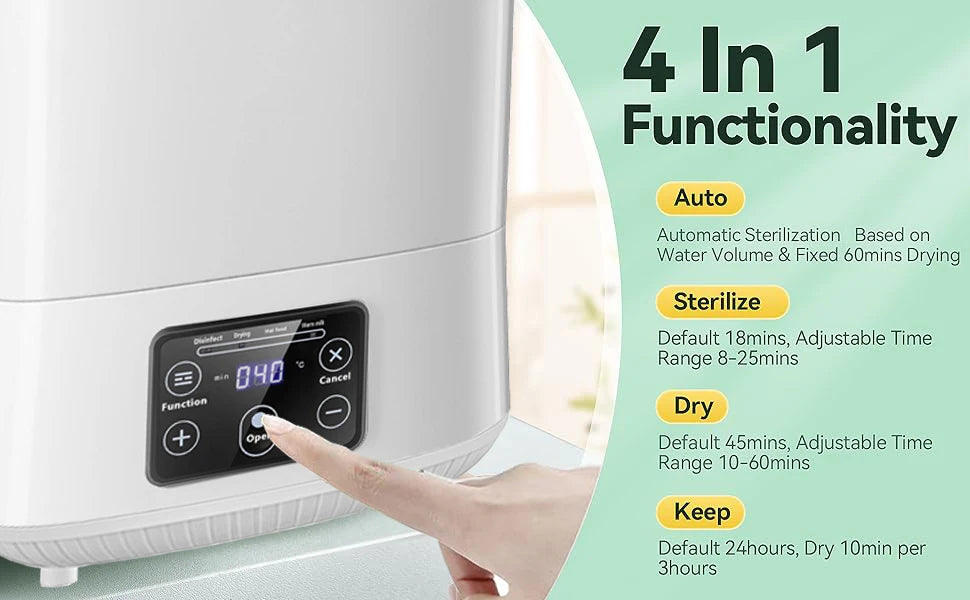 3 6 in 1 multi-function: we hope every new mother can do what she wants to do with the least effort. by putting bottles and parts into baby bottle sterilizer and dryer, you can achieve sterilize only, dry 4 only, 24-hour smart keep, 1 hour auto sterilize & dry, preset sterilize and preset dry.