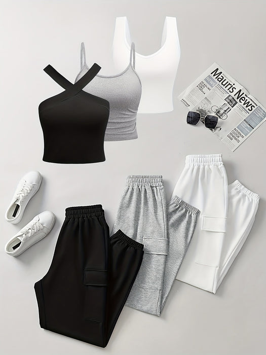 6pcs Women'S Casual Spring/Summer Knit Fabric Set with Crew Neck, Pocket, and Elastic Waist, Polyester Blend