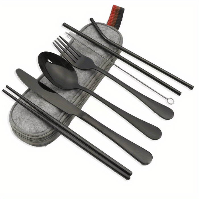 Portable Utensils, Travel Camping Cutlery Set, 8pcs including Knife Fork Spoon Chopsticks Cleaning Brush Straws Portable Case, Stainless Steel Flatware set